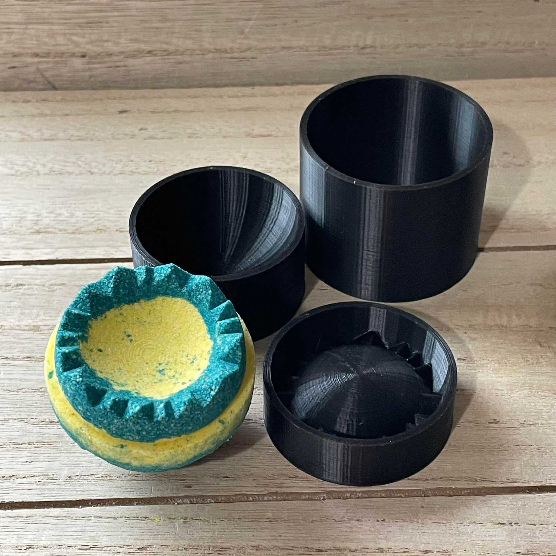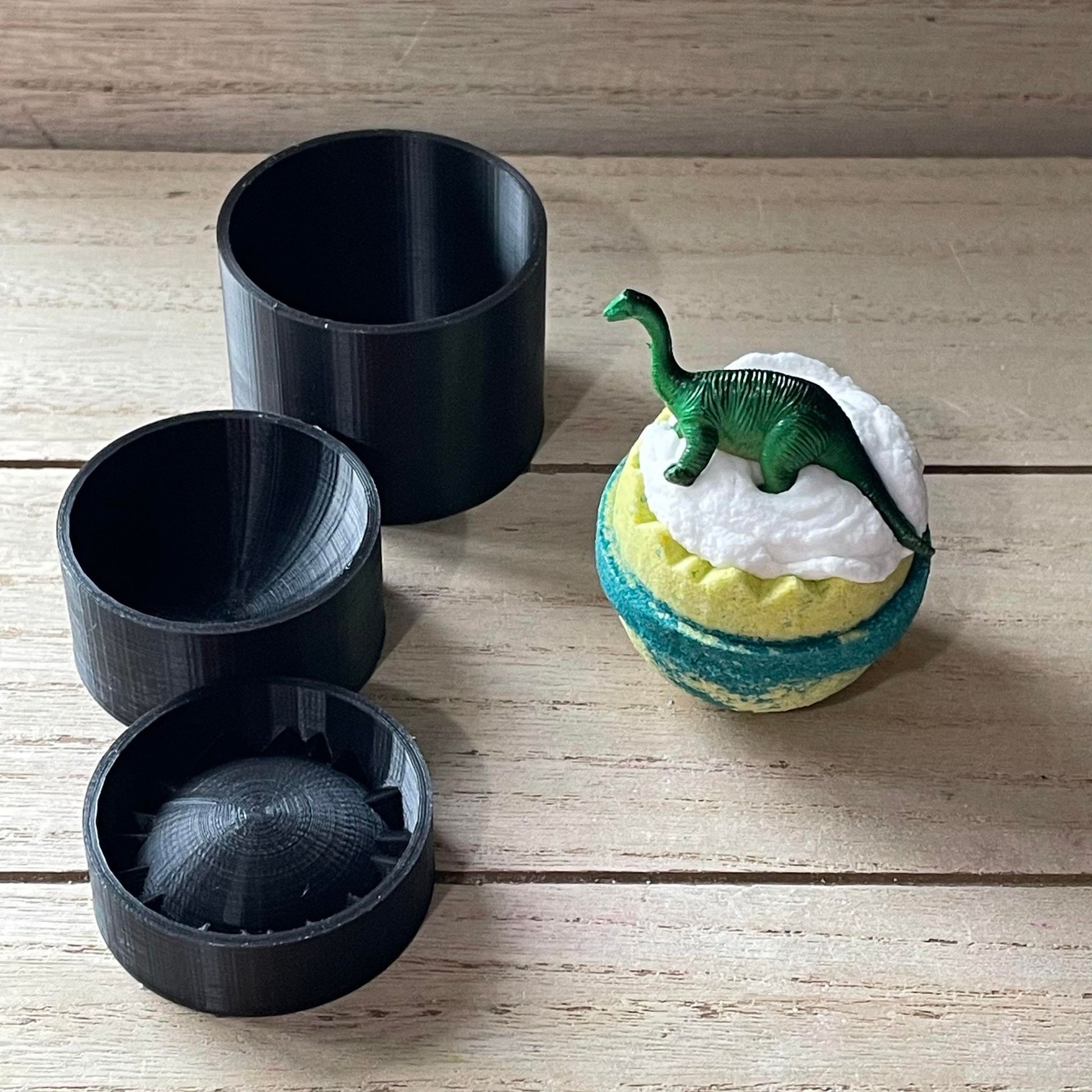 To use:Β Place the bottom piece inside the cylinder.Β Add your bath bomb mixture.Β We recommend weighing it so you can make the same size bomb each time. Place the top piece on top, and then simply press down hard. You can either push the top and bottom piece out of the cylinder by hand, and then unmold, or you can use the plunger to push the pieces out.Β Wipe away any mixture on the inside of the pieces before making the next bath bomb.Β